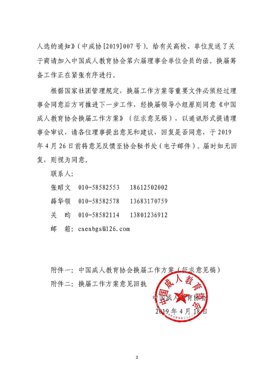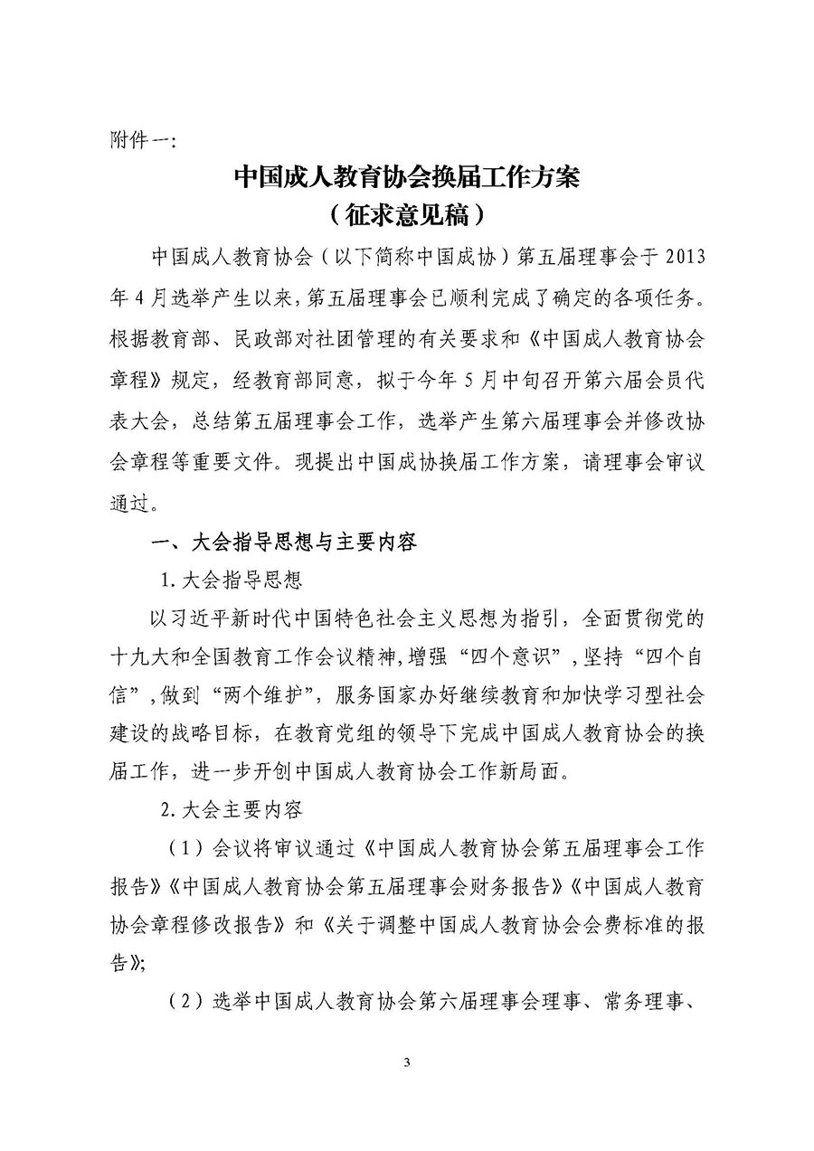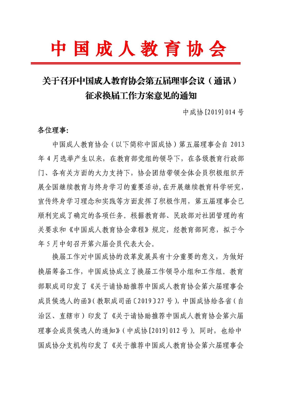關(guān)于召開中國成人教育協(xié)會第五屆理事會議(通訊)征求換屆工作方案意見的通知