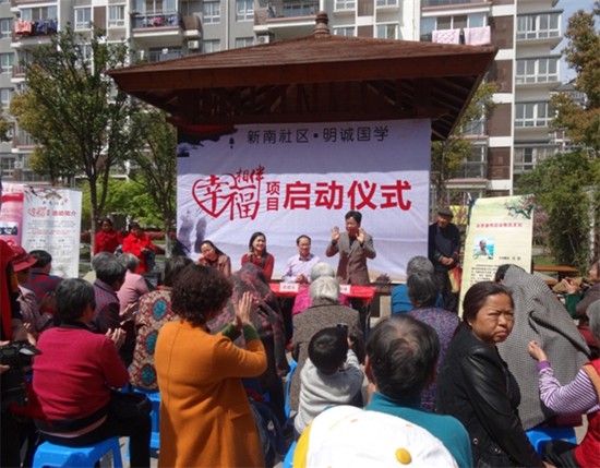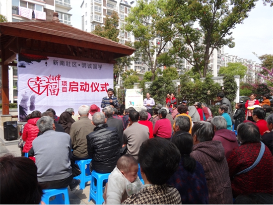 啟動儀式上,大新鎮(zhèn)新南社區(qū)和張家港市明城國學負責人,分別在該項目的子項目“幸福相伴”項目實施合作書上簽了字。該子項目計劃每月一次,以老年人為主體,由張家港市明城國學負責邀請專家老師,通過傳統(tǒng)國學讓老人掌握養(yǎng)心、養(yǎng)氣、養(yǎng)生及保健方法,使社區(qū)老人們的家庭更和睦,生活更幸福,身體更健康,每月通過小區(qū)四塊電子屏、樓道口櫥窗、小區(qū)廣播發(fā)布上課時間地點。