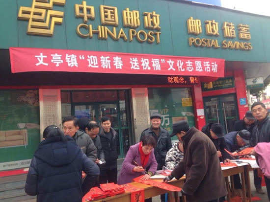 連日來(lái)丈亭鎮(zhèn)老年書(shū)法班學(xué)員及書(shū)法愛(ài)好者們分別在丈亭新老集鎮(zhèn)中心區(qū)域開(kāi)展義務(wù)書(shū)寫(xiě)春聯(lián)活動(dòng),為村民們義務(wù)書(shū)寫(xiě)春聯(lián)300余幅,受到了廣大群眾的熱烈歡迎和一致好評(píng)。