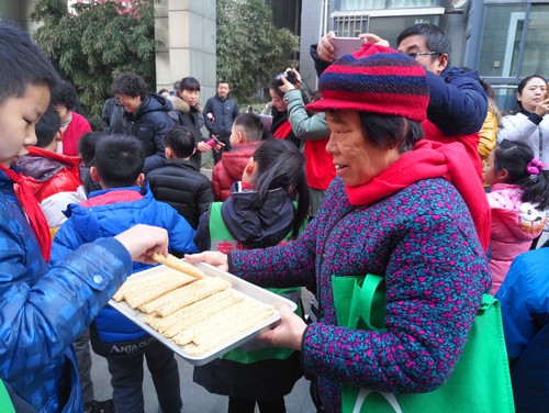 “小孩小孩你別饞,過了臘八就是年。臘八粥,喝幾天,哩哩啦啦二十三。二十三,糖瓜粘,二十四,掃房日……”在社區(qū)小學(xué)生們的歌聲中年俗“廟會”達到了高潮。