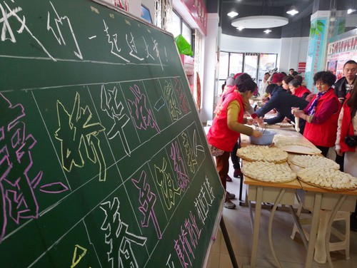 在社區(qū)黨群服務(wù)中心,社區(qū)十多名志愿者正在熱火朝天地包餃子?!拔覀円粫阂蠛玫娘溩铀偷江h(huán)衛(wèi)工、物業(yè)保安等留守在城市,為這個城市建設(shè)付出辛勤勞動的‘親人’手中?!鄙鐓^(qū)主任裴臻說,在我們社區(qū)像周慧玲阿姨這樣的志愿者還有很多,近年來,社區(qū)黨支部經(jīng)過入戶調(diào)查、深入了解,居民所需要解決的,已經(jīng)不是柴米油鹽醬醋茶的問題,而是更高層面的文化需求、精神需求,為此社區(qū)提出“文化興家園”的理念。