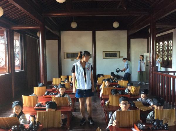 早晨8點,孩子和家長集中在楊家橋村市民學校統(tǒng)一乘車前往恬莊古街,到達恬莊古街的游客中心,置身于古香古色的古建筑群中,孩子們對這里的景觀充滿了好奇。大家首先來到“尋慢國學館”,孩子們在家長的幫助下?lián)Q上漢服、戴上巾帽、系上腰帶,在徐市小學梧桐樹志愿服務隊老師的指導下,在私塾里個個盤腿而坐,拿起竹簡,誦讀經(jīng)典國學《三字經(jīng)》。孩子們讀得瑯瑯上口,讀得津津有味,經(jīng)典誦讀把孩子們帶入了傳統(tǒng)的文化氛圍,在一遍遍的誦讀中感受經(jīng)典文化的博大精深、意境高遠,在獲取知識的同時心靈得到洗禮和震撼。“香九齡,能溫習,孝于親,所當執(zhí)……”讓孩子們感受到的是人性的再現(xiàn),人文精神的頌揚!