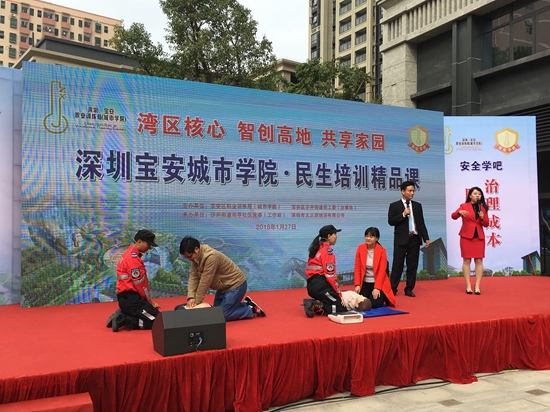 寶安區(qū)職業(yè)訓(xùn)練局(城市學(xué)院)教務(wù)長(zhǎng)(副院長(zhǎng))傅海茫、沙井街道黨工委委員、組織人事部部長(zhǎng)辛文明,區(qū)安監(jiān)局、區(qū)衛(wèi)計(jì)局相關(guān)負(fù)責(zé)同志以及沙井后亭社區(qū)居民約150人參加活動(dòng)。