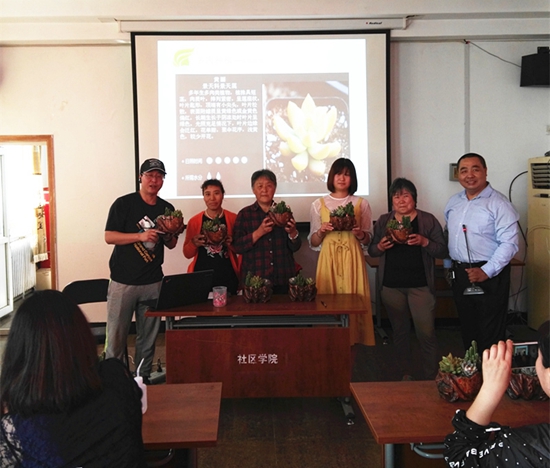 賈老師從家庭綠色植物種植對人的身體影響入手,講到多肉植物在世界及我國周邊國家的種植狀態(tài),逐漸過度到多肉植物對我們身體健康成長的好處,最后講到多肉植物的種植與平時的管理。賈老師在講課中慷慨激昂,語言生動,旁征博引,使參加培訓(xùn)的人員聽得非常入神,課堂上不時傳來學(xué)員們的掌聲和歡笑聲。