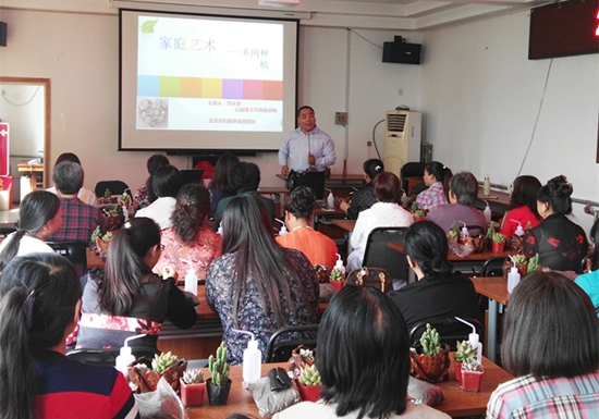 5月9日上午,社區(qū)學(xué)院與潭柘寺鎮(zhèn)教科文體辦公室在趙家臺村委會共同組織了多肉植物種植培訓(xùn)。主講的老師是北京市婦聯(lián)環(huán)保組組長、公益綠主婦高級講師賈慶恩老師,潭柘寺鎮(zhèn)各村的計生辦專干及鎮(zhèn)機關(guān)的部分干部共60余人參加了培訓(xùn)。