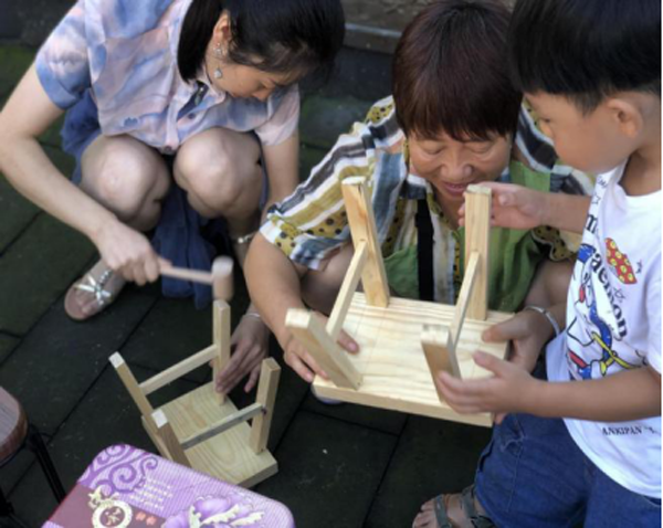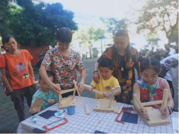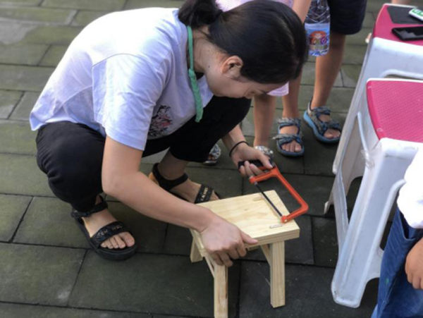 2021年8月23日,“小小木工坊”開始啦,活動旨在促進院落兒童了解木工工藝文化,激發(fā)小朋友對木藝的興趣,培養(yǎng)其耐心專注的工匠精神。活動過程中,小朋友們分組合作,有的拉鋸子,有的上膠水,有的負責組裝,有的負責敲敲打打。經(jīng)過一個個“小魯班”的巧手制作打磨,精美的小木板凳完成了,雖不能算巧奪天工,卻也凝聚了小朋友們的勞動與智慧。