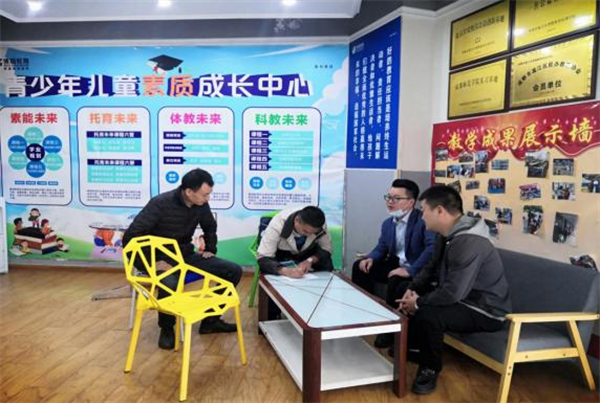 隨著“雙減”工作的持續(xù)開展,江安社區(qū)教育工作站認(rèn)真部署、嚴(yán)格落實(shí)區(qū)“雙減”各項(xiàng)政策、任務(wù)要求,多管齊下,積極推動(dòng)轄區(qū)內(nèi)校外培訓(xùn)機(jī)構(gòu)的“雙減”工作。10月13日下午,江安社區(qū)教育工作站聯(lián)動(dòng)區(qū)人社局監(jiān)察大隊(duì)、公平街道勞動(dòng)保障所對(duì)社區(qū)教育工作開展情況進(jìn)行走訪摸排。本次摸排行動(dòng)主要針對(duì)轄區(qū)內(nèi)的培訓(xùn)教育機(jī)構(gòu)開展,在摸排過程中就是否存在運(yùn)營(yíng)風(fēng)險(xiǎn)、家長(zhǎng)退費(fèi)、員工欠薪、欠租金、社保購(gòu)買情況等問題,對(duì)轄區(qū)教育機(jī)構(gòu)經(jīng)營(yíng)風(fēng)險(xiǎn)進(jìn)行了大排查,并對(duì)各機(jī)構(gòu)負(fù)責(zé)人做了“雙減”政策的宣傳講解。