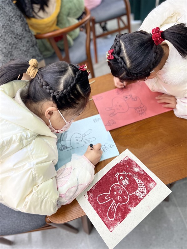 活動(dòng)中,老師介紹版畫是繪畫形式的一種,在我國(guó)已有1000多年的歷史。它是在版上刻出圖樣,再?gòu)?fù)印于紙上的一種獨(dú)特的繪畫藝術(shù)。這種繪畫藝術(shù)常見(jiàn)于中國(guó)傳統(tǒng)節(jié)日當(dāng)中,如春節(jié)。就像這一次,我們就要運(yùn)用版畫藝術(shù),來(lái)制作“迎春·lucky兔you”啦。