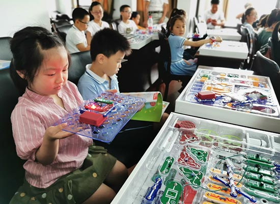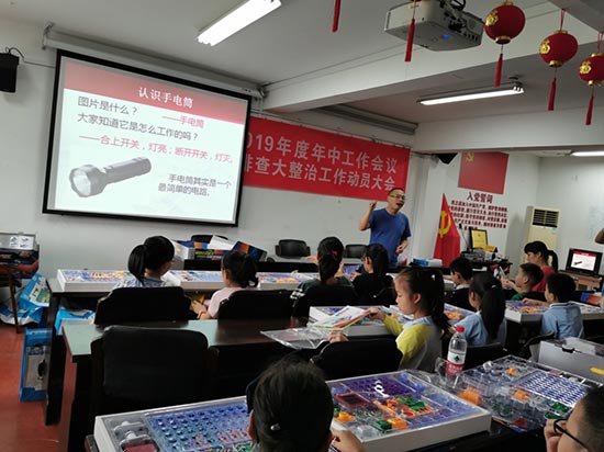 “亮了”“轉(zhuǎn)了轉(zhuǎn)了”,2個(gè)多小時(shí)里,孩子們學(xué)在其中、玩在其中、樂(lè)在其中,盡情享受著電子元器件帶來(lái)的快樂(lè),并在自己親手搭接的風(fēng)扇里享受著夏日的清涼。