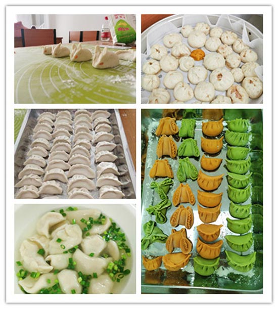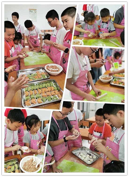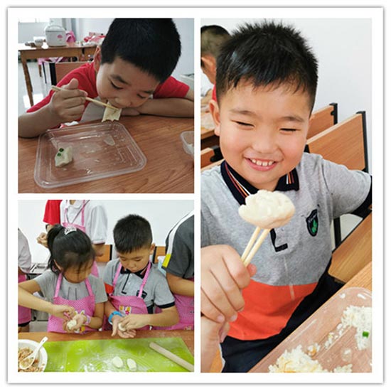 活動(dòng)第二項(xiàng),“傳承美食,做中華小當(dāng)家!”。“同學(xué)們,今天的選用的全都是綠色食品:肉糜、面粉都是今天早上在歐尚超市買的,揉成的面團(tuán)呈現(xiàn)綠色和桔黃色,是因?yàn)槲曳謩e添加了菠菜汁、胡蘿卜汁,沒有色素,這樣做出來的餃子、包子才健康、營養(yǎng)!”。孩子們戴上圍裙,圍在餐桌前,認(rèn)真仔細(xì)地聽社區(qū)劉愛華老師講解和示范。面粉戳條、切小段、搟皮、包餡兒、捏邊封口,一氣呵成。除了日常的水餃、包子外,更有綠色的“知了餃”、 橘色的“冠頂餃”白色的“小兔包”,栩栩如生,十分可愛。孩子們沉浸在動(dòng)手的樂趣中,自己包的包子和餃子,吃起來更美味呢!