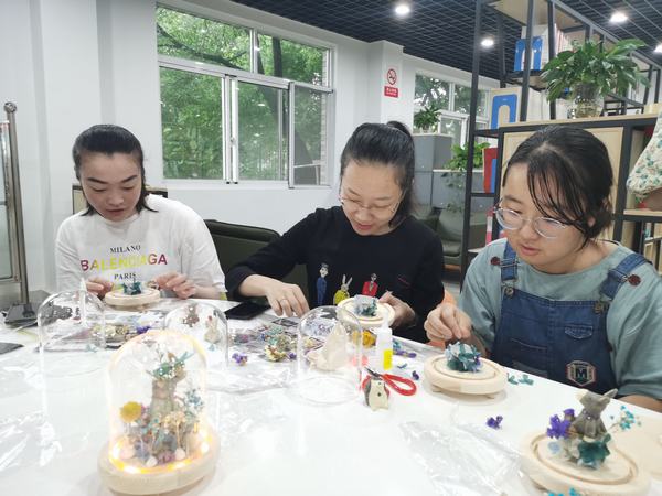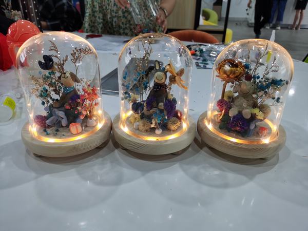 本期活動(dòng)內(nèi)容是“罩住美麗,星光閃耀”手工制作,活動(dòng)邀請了喜物手工坊的沈添老師前來教學(xué),活動(dòng)中,沈老師先給學(xué)員科普了一下鮮花、永生花、干花、仿真花的區(qū)別,隨后給學(xué)員講解玻璃罩花藝的制作流程。在老師的引導(dǎo)下,修剪、整枝、構(gòu)思、造型,一個(gè)個(gè)別出心裁、充滿奇思妙想的玻璃罩花藝不斷完美呈現(xiàn),在燈光閃耀下引人入勝。