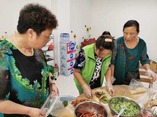 學員們紛紛表示很高興能參加這次活動,李阿姨說:“以前在店里吃過,今天自己學做煎餅果子,學會了回家做給孫子吃。真是太好了!”