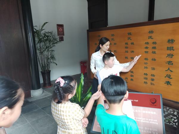 活動之前,孩子們已經(jīng)在家自學了榜眼府的講解詞,一開始,就有孩子自告奮勇地開始了講解介紹,雖然不是那么熟練,但是勇氣可嘉。老師給孩子們進行了語句、肢體動作的糾正,手勢的配合等知識點的強調。孩子們在一次又一次的嘗試中不斷進步:趙子博小朋友準備充分,講起“榜眼府”歷史文化頭頭是道,雖然正式講解時,有些許緊張,但是聲音清晰,思路清楚,表現(xiàn)相當優(yōu)異;錢孜燁小朋友從一開始的緊張無法出聲,到之后勇敢嘗試突破自我,值得稱贊;蔡思瑜小朋友神態(tài)從容大方給大家介紹“榜眼府第三進”,雖然不太熟練,勝在自信,如果多加練習,肯定能是一名不錯的“小導游”……還有不少年齡比較小的小朋友也不甘示弱,勇敢嘗試,也是表現(xiàn)不錯。最后,老師帶領大家一起完整地參觀了榜眼府,了解了榜眼府的歷史,從中體會到了一些以前不了解的古街文化。