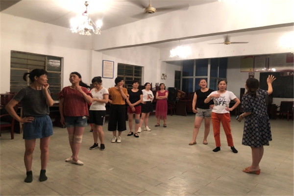 在穿山社區(qū)的文化禮堂內(nèi),隊員們首先展示了自己的舞蹈,王老師從肢體動作表達到面目表情展現(xiàn),對大家進行了認真系統(tǒng)性的講解、指導,尤其是難點工作,還手把手地進行手勢、步伐等技術輔導,隊員們非常開心得一邊學習、一邊練習,經(jīng)過兩個小時的精心教導,大家對舞蹈的體會和領悟有了進一步的提高,獲得較大的滿足感和成就感。