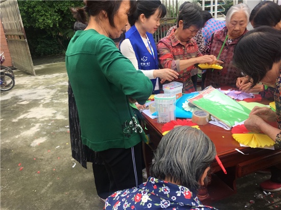 今天的活動(dòng)以“愛(ài)就在身邊”為主題,在即將到來(lái)的520告白日,心家園社工教授“助人為樂(lè)”服務(wù)隊(duì)制作手工折紙花,借花表達(dá)心中的無(wú)限柔情蜜意?;顒?dòng)現(xiàn)場(chǎng),心家園社工將隊(duì)員們分成三組,各組推選出一位組長(zhǎng)負(fù)責(zé)協(xié)調(diào)組員們開(kāi)展活動(dòng)。然后社工一邊用彩色卡紙示范一邊解說(shuō)詳細(xì)制作過(guò)程和注意事項(xiàng)。各組服務(wù)隊(duì)成員們按照社工的步驟,利用現(xiàn)有的材料,認(rèn)認(rèn)真真的開(kāi)始創(chuàng)作自己的花兒。在制作過(guò)程中,各組隊(duì)員在組長(zhǎng)的帶領(lǐng)下分工協(xié)作,有的擅長(zhǎng)折紙,有的很會(huì)剪裁,有的負(fù)責(zé)粘貼,他們互幫互助、相互配合,偶爾還和隔壁組交流制作心得,現(xiàn)場(chǎng)氣氛活躍而融洽。
