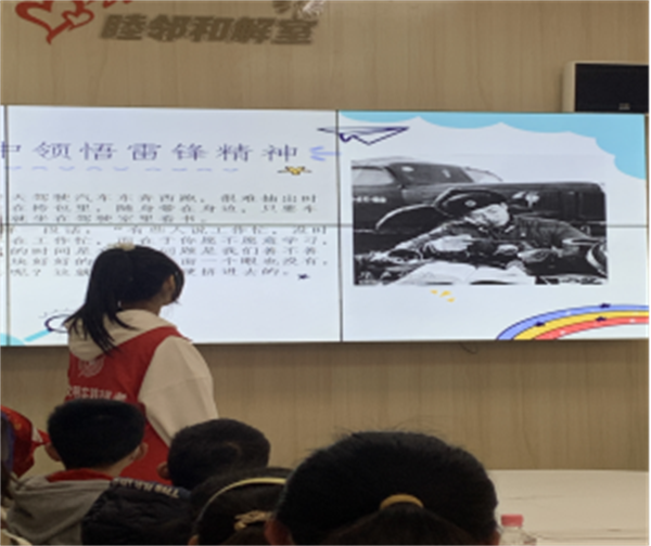 活動邀請了轄區(qū)的15小學生,社工給大家講了雷鋒是誰,什么是雷鋒精神,讓大家認識雷鋒,了解雷鋒的生平事跡,告訴小朋友們雷鋒是一位關心別人、幫助別人、經(jīng)常為別人做好事的解放軍叔叔,學習雷鋒助人為樂的光輝事跡,學習雷鋒遇到困難,不認輸、勇往直前的精神。學雷鋒要從身邊做起,從小事做起,以實際行動向雷鋒學習。接著,社工和大家一起學習了關于雷鋒的歌曲《學習雷鋒好榜樣》,在歌聲中學習,還講述了雷鋒留下的無數(shù)助人為樂、無私奉獻的小故事。
