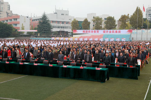 2015年11月6日,由市教委、北碚區(qū)委區(qū)政府主辦,重慶廣播電視大學(xué)、主城九區(qū)教委、北碚區(qū)職教中心、北碚區(qū)社區(qū)教育學(xué)院承辦的,以“倡導(dǎo)全民終身學(xué)習(xí),推進(jìn)法治社會(huì)建設(shè)”為主題的重慶市2015年全民終身學(xué)習(xí)活動(dòng)周開幕式在北碚舉行。市人大常委會(huì)副主任沈金強(qiáng)、市教委主任周旭、北碚區(qū)政府區(qū)長(zhǎng)汪夔萬(wàn)、市人力社保局副局長(zhǎng)謝辛、北碚區(qū)人大副主任韓燕、北碚區(qū)政府副區(qū)長(zhǎng)劉永、重慶廣播電視大學(xué)副校長(zhǎng)胡繼明、北碚區(qū)委教育工委書記楊平等領(lǐng)導(dǎo),市文明辦、市財(cái)政局、市文化委、市民政局、市教委相關(guān)處室、市電大、市教科院、市評(píng)估院的有關(guān)負(fù)責(zé)同志,北碚區(qū)區(qū)委、區(qū)人大、區(qū)政府、區(qū)政協(xié)有關(guān)負(fù)責(zé)同志,區(qū)教委及區(qū)級(jí)有關(guān)部門的負(fù)責(zé)同志,38個(gè)區(qū)縣教委、全市13個(gè)區(qū)縣社區(qū)學(xué)院負(fù)責(zé)同志,北碚區(qū)的相關(guān)街鎮(zhèn)、教師、學(xué)生和市民代表及新聞界的朋友,近3000人參加了開幕式。會(huì)議由市教委副主任黎德龍主持。