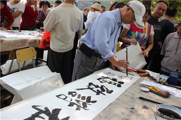 居民進行現(xiàn)場書法展示,受到居民熱捧,爭相求字
