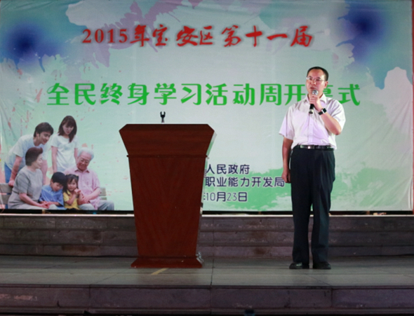 胡細銀副區(qū)長在講話中肯定了開幕式內(nèi)容豐富、節(jié)目精彩、形式新穎。同時,他強調(diào),學(xué)習(xí)是建設(shè)創(chuàng)新型城市的基礎(chǔ),終身學(xué)習(xí)能夠讓我們高雅,讓我們快樂,讓我們的夢想實現(xiàn),要把終身學(xué)習(xí)作為面對21世紀和未來最要緊的事情來對待。對于寶安區(qū)終身教育和社區(qū)教育工作今后發(fā)展,他指出要加快完善我區(qū)終身教育體系,辦成辦好寶安區(qū)社區(qū)學(xué)院,鼓勵辦好企業(yè)大學(xué),探索成立創(chuàng)客學(xué)院;打造學(xué)習(xí)型城區(qū)、學(xué)習(xí)型社區(qū),廣泛開展各類學(xué)習(xí)型組織創(chuàng)建活動;擴大學(xué)習(xí)服務(wù)的對象和范圍,豐富學(xué)習(xí)的方式,加快建設(shè)具有PC端、手機APP和微信公眾號等多終端的社區(qū)教育和職業(yè)培訓(xùn)數(shù)字化學(xué)習(xí)平臺,為實現(xiàn)“人人學(xué)習(xí)、處處學(xué)習(xí)、時時學(xué)習(xí)”提供支持和保障,通過科技手段加強線上線下互動學(xué)習(xí),打造學(xué)習(xí)圈,積累學(xué)習(xí)行為數(shù)據(jù),加快學(xué)習(xí)成果轉(zhuǎn)化,激發(fā)居民的學(xué)習(xí)熱情和創(chuàng)造潛能。最后,他期望看到寶安市民終身學(xué)習(xí)蔚然成風(fēng),甚至在全市也能引領(lǐng)潮流,以及引用了高爾基“書籍是人類進步的階梯”名言,號召廣大居民“活到老,學(xué)到老”,通過學(xué)習(xí)在進步的階梯上邁出堅實的步伐。