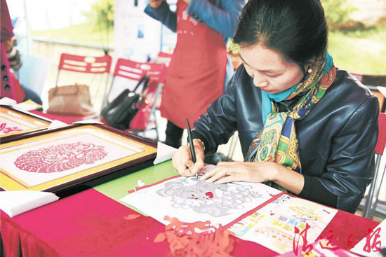 參加活動的市民現(xiàn)場展示藝術(shù)剪紙