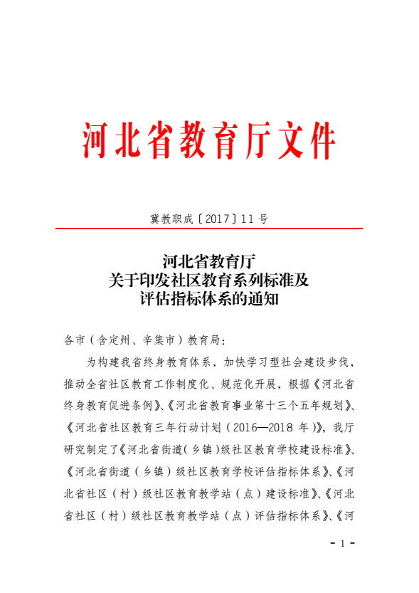 河北:關(guān)于印發(fā)社區(qū)教育系列標(biāo)準(zhǔn)及評估指標(biāo)體系的通知